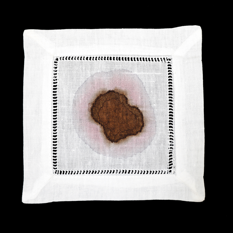 In A Labor of Love, Jorgensen continues her exploration of the apple as a familiar symbol. The piece comprises three main elements.“There are dinner napkins, cocktail napkins and then the Body Archive images,” says Jorgensen. Reminiscent of Michelangelo‘s The Last Supper and Judy Chicago’s Dinner Party, Jorgensen smashes 13 apples on each table setting, leaving messy, urine-like residue on the dinner napkins while the cocktail napkins are stained with wine and blood.
