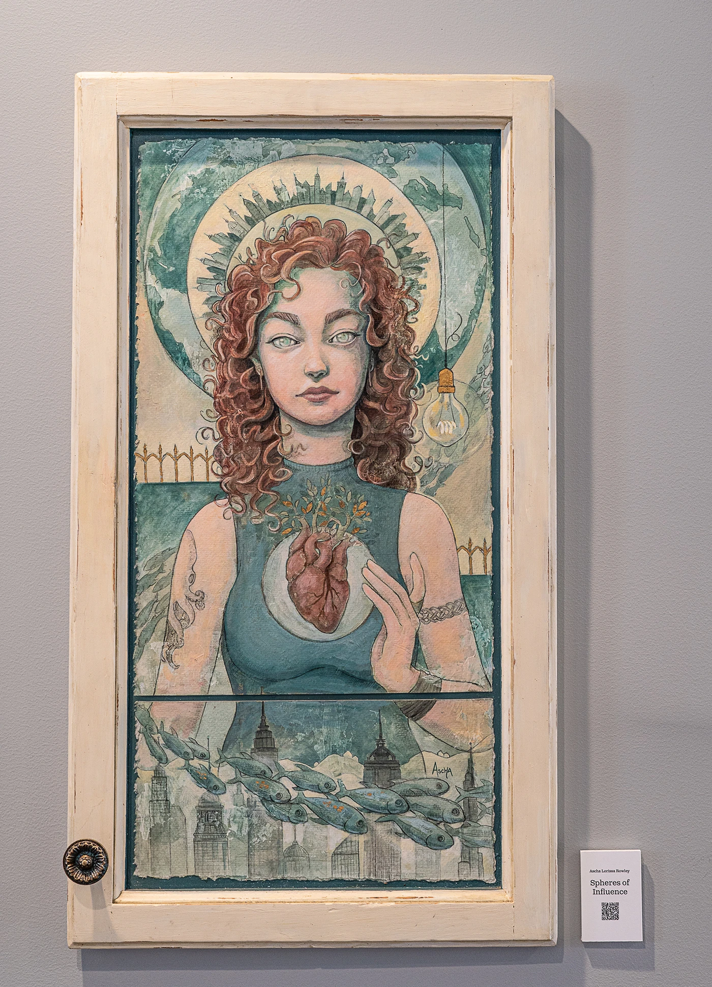 The art ranges from watercolor to photography, mixed media and everything in between. Perhaps the most notable work in the Salt Lake gallery is Winged Dress, a 57.5” x 42.25” oil on panel work by J. Kirk Richards that depicts a rainbow angel’s wings coming off of an empty dress. In contrast to Richards’ abstract work, longtime Encircle artist Colby Sanford uses acrylics to create realistic depictions of humans and the raw emotion that they express in different situations. Other artists such as Megan Ah You and Annie Farley depict the serene and calming beauty of nature while Ascha Lorissa Rowley, the artist behind Spheres of Influenced, use mixed media to create ethereal, semi-abstract pieces rich in symbolism.