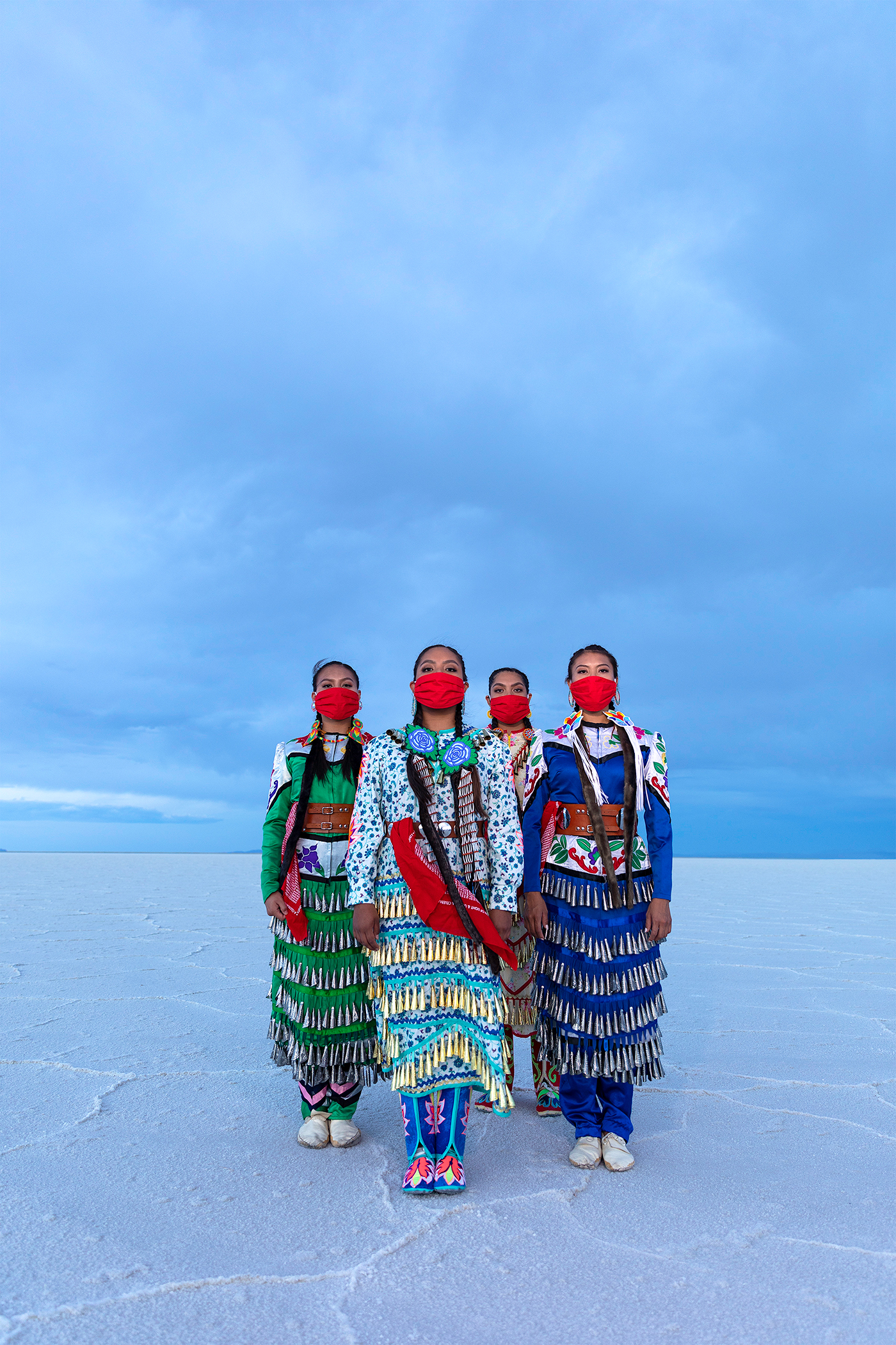 With the help of his two daughters, Erin and Dion Tapahe, and their friends JoAnni and Sunni Begay, the group made a trip to the Bonneville Salt Flats for a photoshoot. He explains his vision: “I wanted there to be a unification between the landscape and the girls … that they were working together,” he says. Despite challenging weather conditions, they trusted the importance of this project and Tapahe instructed the girls to listen to the land and begin to pose. Suddenly, the weather cleared, causing the Salt Flats and the sky to glow blue. They began their dance, and Tapahe felt the same feeling from his dream: “We could feel the ancestors of that land, like they were there, like they were dancing with them, like they were happy,” he says.