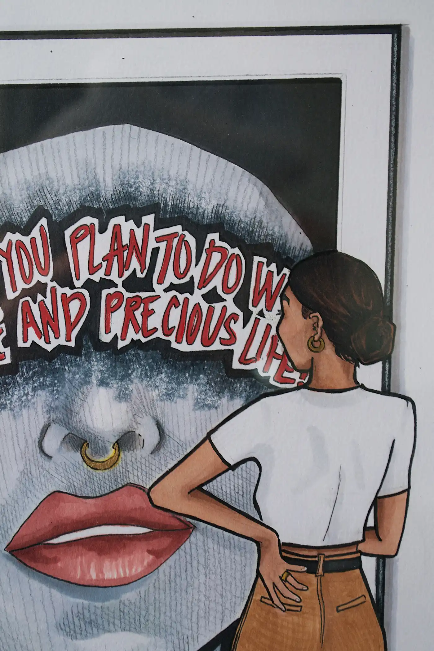 The quotes that Aphayrath jots down tend to be snapshots of scenes that she sees first hand, and the most poignant moments revolve around expressions of love and self. “I love seeing people interact with each other as friends, family or lovers. I love sibling interaction, the overall art of conversation and the little displays of love in life,” she says. The subtle mannerisms through which others express these internal truths are elements of Aphayrath’s work. At a music festival, Aphayrath noticed a couple riding a bike together. “He was a foot taller than [his partner], and she was on the pegs of his bike hugging him from behind. Something about the way she was holding onto him stood out to me,” she says. Aphayrath has an eye for the quiet moments within human expression, and she sets out to draw the spaces between what is said and what is shown.