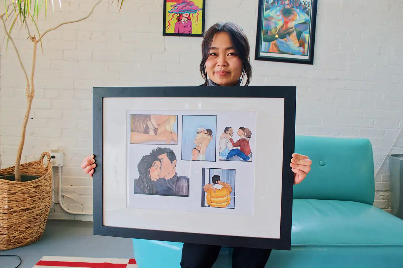 Her time and effort drawing has been well spent as her first show, P.S Love Mel, was well received. “It was eye opening to see the response in the community [and to have] so many people come up to me and ask me about my pieces,” says Aphayrath. Part of the intimacy of Aphayrath’s work is how her original pieces are torn right from her sketchbook and displayed. This shows an unmistakable and unguarded richness, a level of exposure Aphayrath recognizes. “I love looking at other people’s sketchbooks. They may be a painter and creating a huge piece, but their sketchbook shows a little bit more of who they are,” says Aphayrath. For those who may miss out on the opportunity to own a unique piece of her sketchbook, Aphayrath is working on a solution. “I am digitizing my work and creating prints since people really showed interest,” she says.