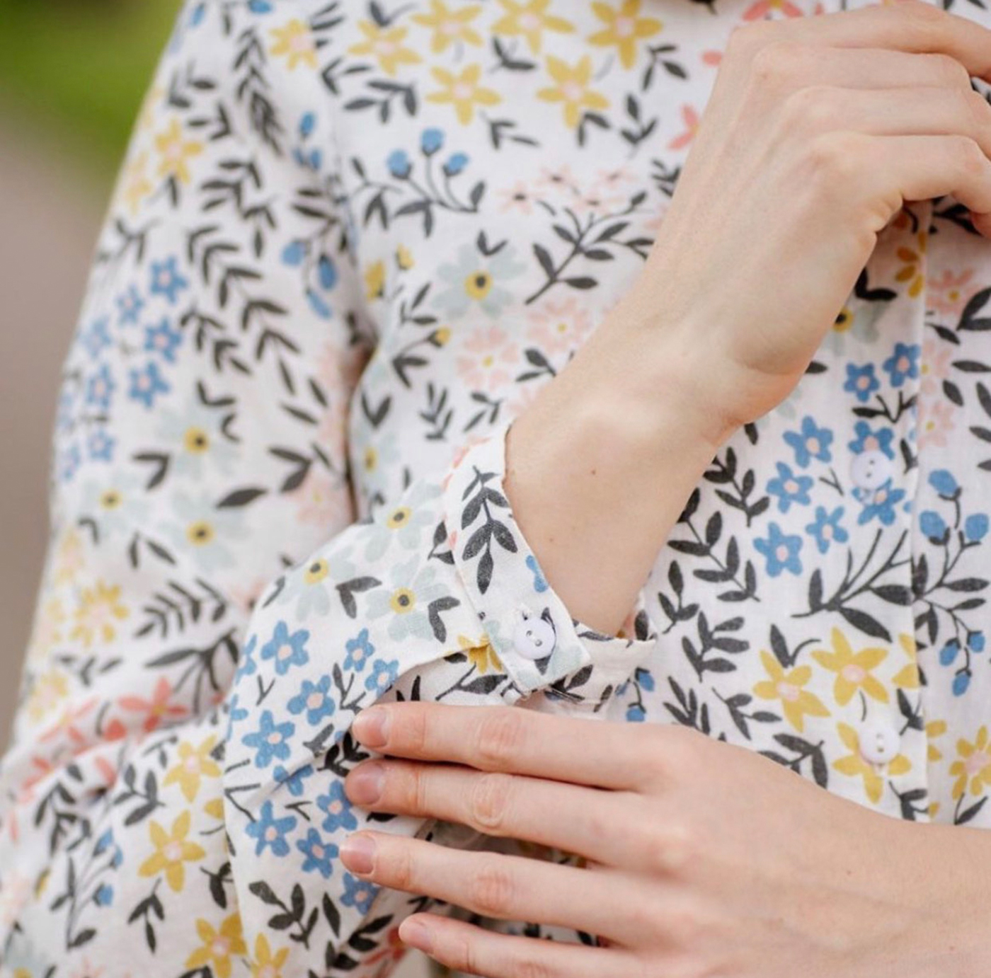 Growing up, Demkov’s family helped nurture her passion for the outdoors, botanicals and art. “My family and my grandma particularly encouraged my love of drawing from the time I could pick up a crayon,” she says. From her grandma’s vibrant garden to her floral and botanical decor, Demkov found herself surrounded by what would largely become the bedrock of her artwork and inspiration. “I almost always instantly start thinking of how I will use a particular color scheme or flowers from a garden in a design,” she says. Along with botanicals and animals, Demkov draws inspiration from the architecture of historical landmarks and the embodiment of color schemes in landscapes. These inspirations manifest in her work for Son De Flor (linen dresses) or The Foggy Dog (dog bandanas).