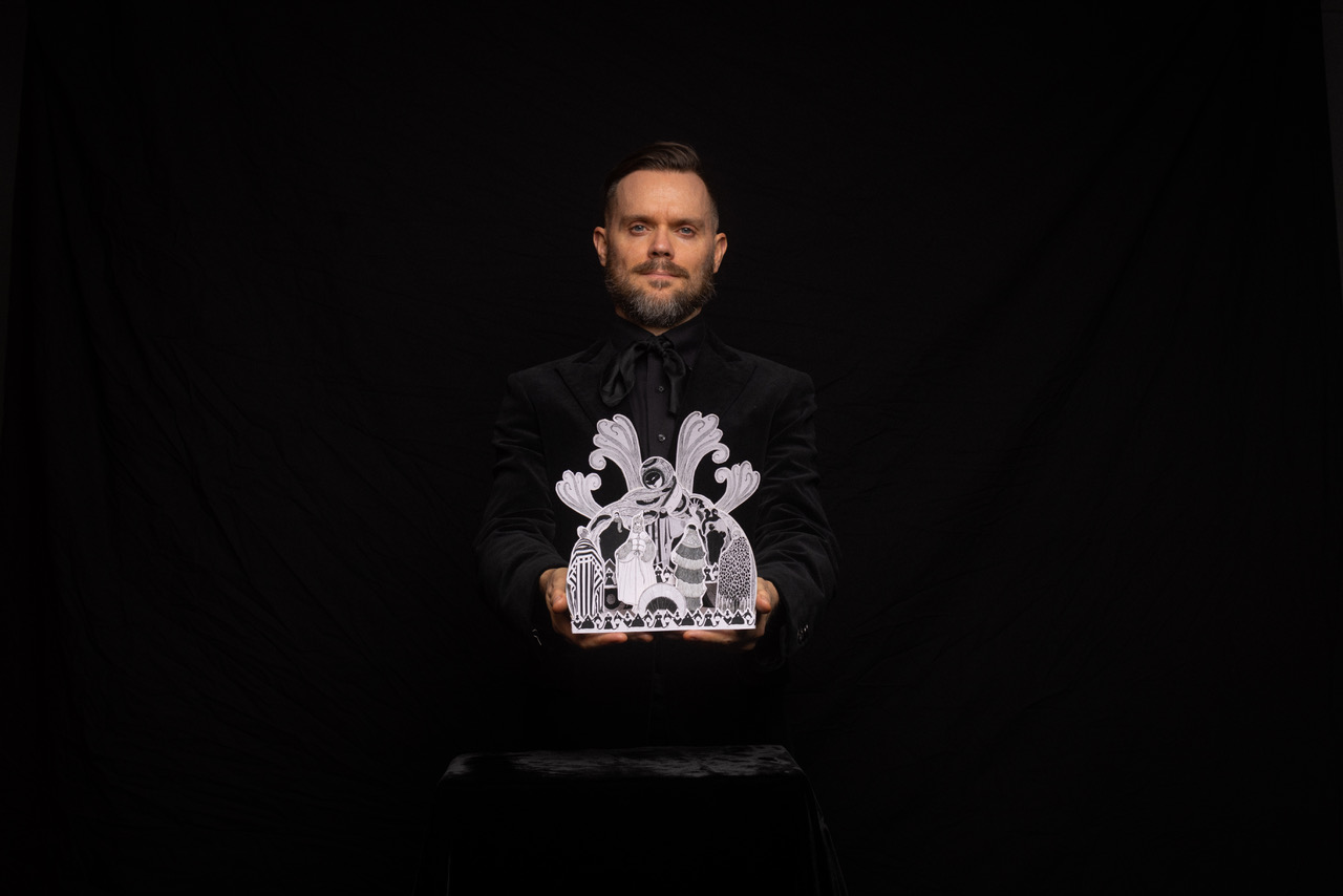 For his first set of toys, Gold took four initial ideas from hundreds he has sketched out over over the years and came up with a winter-themed set of four toys to release this holiday season: Welcome Krampus: Black Gingerbread Lodge House for Krampus; Fashion Snow: Art Deco Fashion Illustration; Snow Bells: Art Deco Jeweled Stand of Snow Bell Flowers; and Starlight Sleigh Ride: The Beautiful Snow is in My Soul. The toys are in the form of prosceniums–intricate, sturdy paper sets fashioned after the models theater companies build for stage shows. Gold designed the models, constructed them by hand, cut them out, colored them, installed lights on them and posted the models online, where people can then view and order the products. Gold also accepts custom orders.