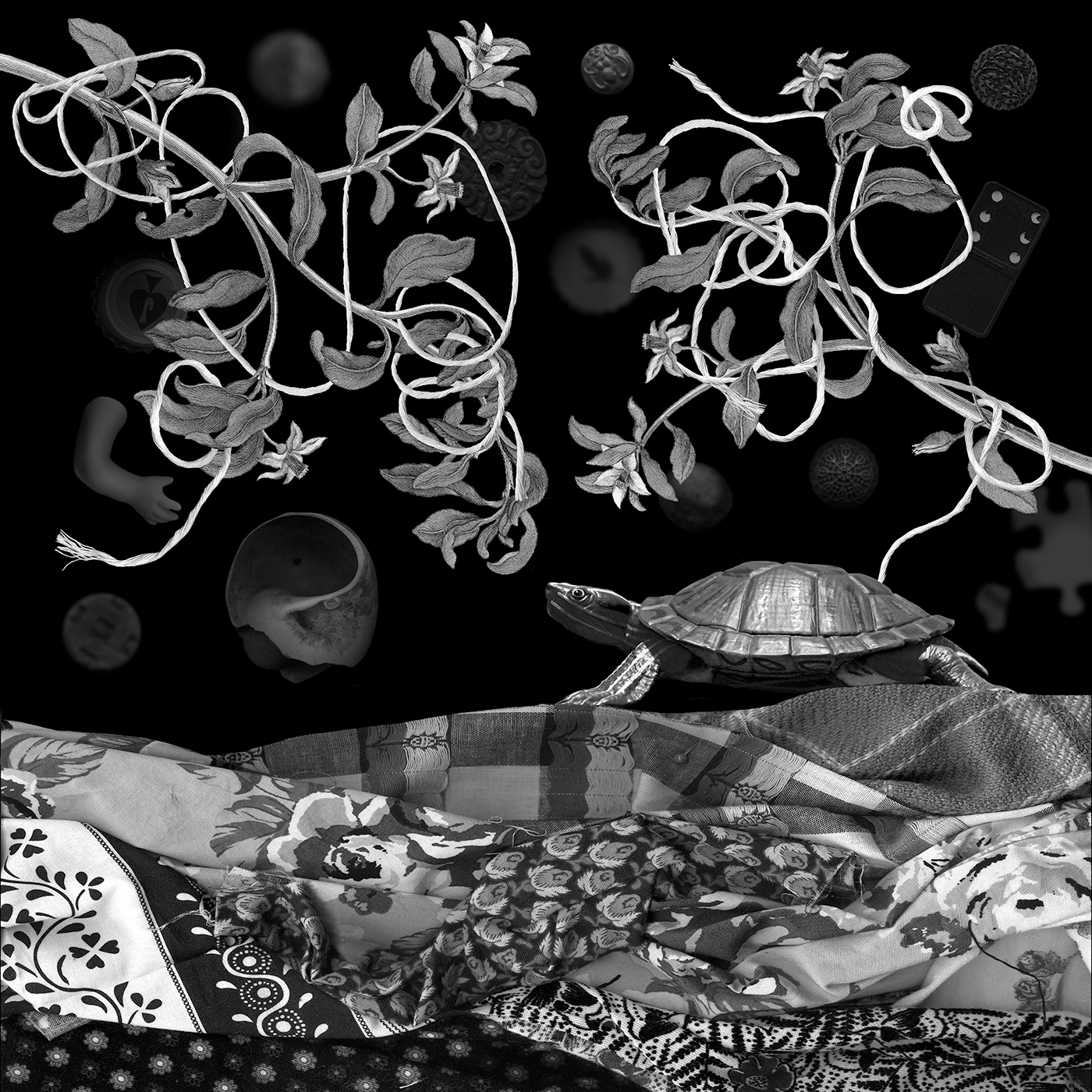 Turtle and Flowers, 2019, 30×30, digital collage.