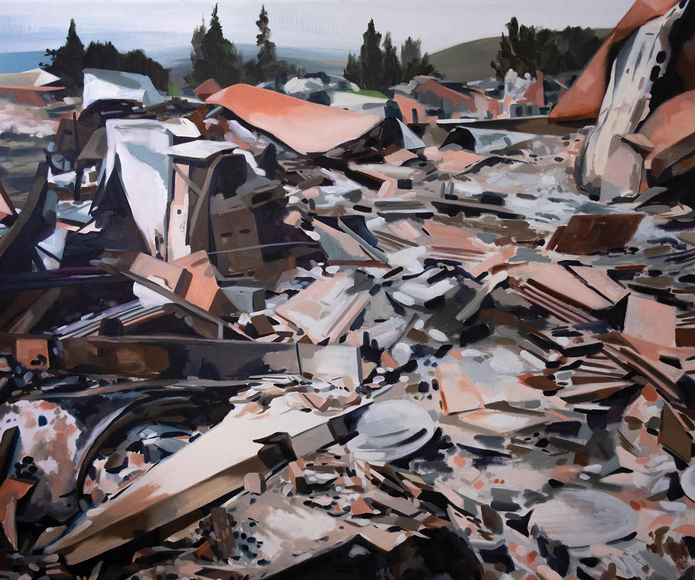At 48 by 60 inches, “Mattek-Sands” is among the collection’s larger works. The painting features iconic tennis athletes James Murray and Bethany Mattek Sands smiling victoriously with a shining trophy in hand. The image feels immediately familiar: It’s celebrated champions backed by waving American flags. A theme of Miscellaneous Debris is the simultaneous attraction and repulsion that Wagstaff feels with certain images. In “Mattek-Sands,” our collective desire for reverence and celebrity status is in the balance, but so is the uncomfortable examination of how we define winning in our culture. Also in the category of sporting subject matter, the painting “North Korea: World Cup Champions” is based on “a weird Youtube video of a North Korean news anchor showing highlights of the North Korean soccer team winning the world cup.” Given the volume of information available, Wagstaff says, “You can find whatever ‘facts’ you want. That puts us squarely in a ‘Post Truth’ situation.” Another painting, “Aftermath 2,” depicts scattered aftermath of a disaster and explores the process of how traumatic events and loss eventually transition into an unfamiliar equilibrium.