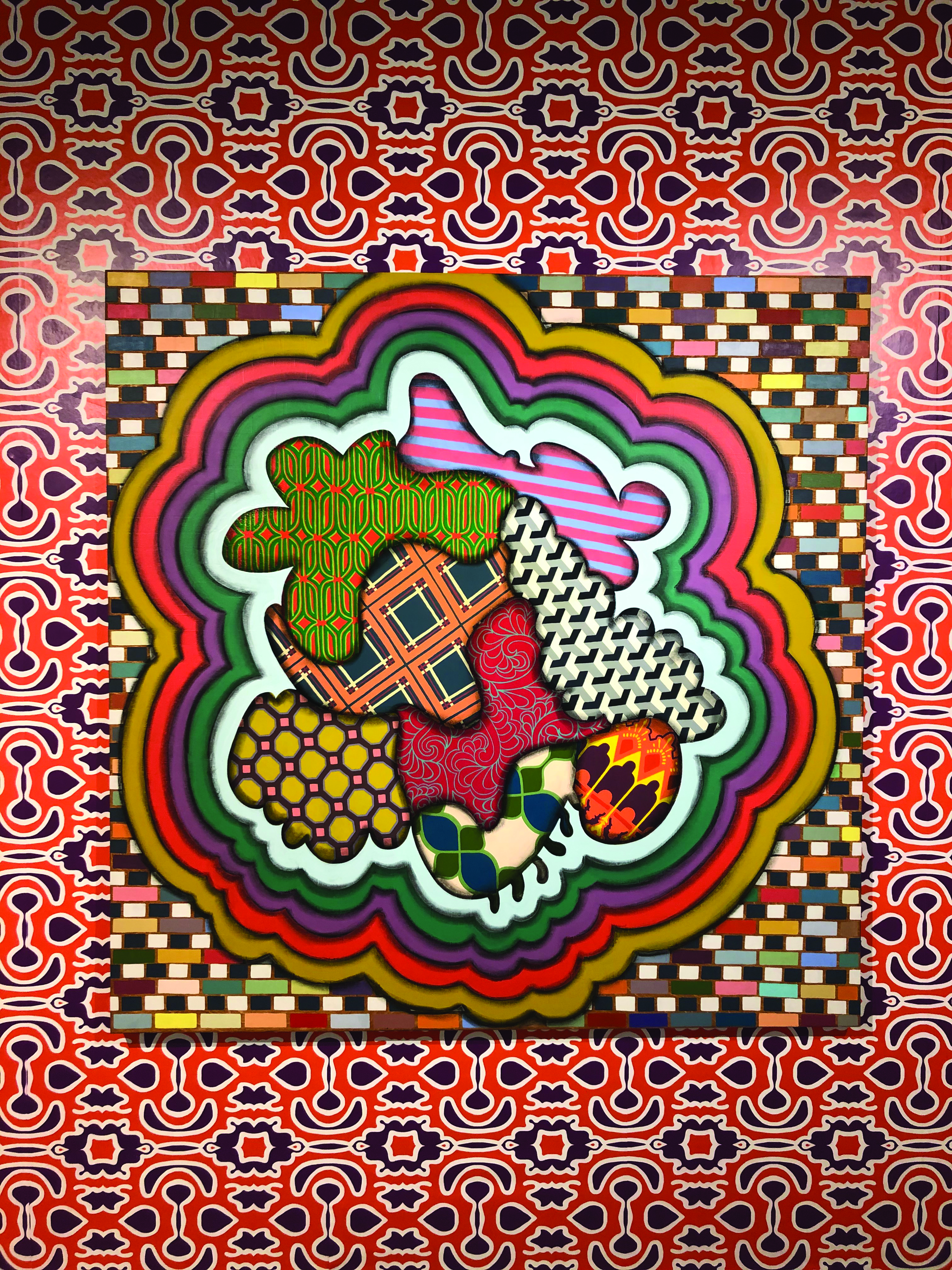 Each work at the exhibit is untitled, but there is a sense of conceptual progression if you view the gallery moving left to right, (east to west). The first piece hangs loosely and without a firm canvas. Instead the piece is positioned on a paper that looks like it sat in the sun too long. Depicted is a simple pattern of red circles that ring a core of olive circles, a dark green color filling the spaces in between. Like the paper canvas itself, the pattern distorts in areas as though it just came out of the oven. The pattern is not a pattern in the sense that it repeats perfectly, but it is a pattern in its ability to—at first glance—make an oozy texture feel prim. The closer you inspect, the more easily you absorb it’s achievement of simultaneously functioning as a pattern while disregarding the form.