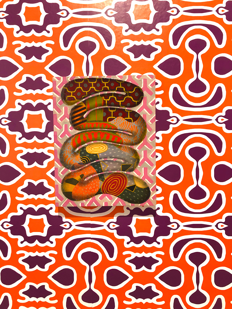 Continue along this line of thinking, and the rest of the exhibit only becomes more potent food for thought. The abstract nature of the exhibit means you might need to shift your brain into a weird gear for weird thinking, but the headspace is genuinely fun to poke around and pose thoughts in. A late piece shows the bowel-like shape travelling between two canvases. The bowel is filled with contrasting patterns as it sits in the canvases but remains white, blank and inert, where it sits between them. It’s as though a creative energy, rooted in the body and nature through its gut shape, penetrates the patterns and decorates them with life. The canvas works with the fluid tube shape to make formal art, both by providing a frame and by conferring the status of art through its rigid dimensions.