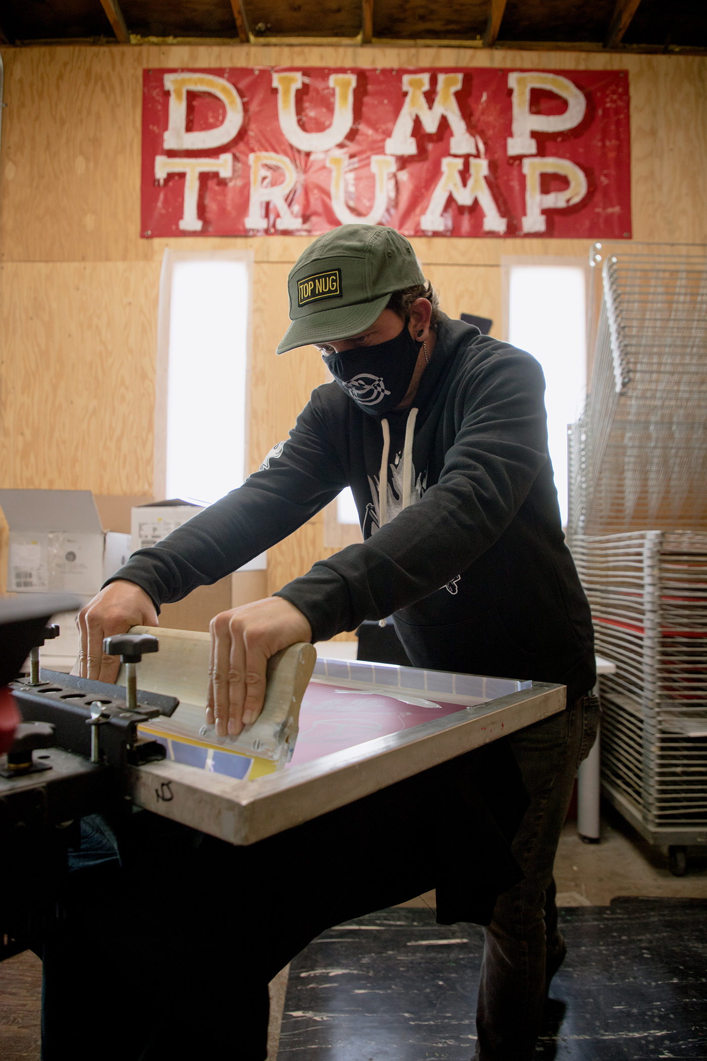 On its website, Surmise describes itself as “an anarchist screen printing collective” with a goal to “express radical ideas through T-shirt and fashion design.” There’s an obvious paradox with a capitalistic company describing itself as “anarchist” that Jones is more than aware of, saying it’s in this paradox that the company chooses to thrive. “Obviously, I’m a business owner in a capitalist world,” Jones says. “That, in no sense, can reflect what anarchism is. That’s part of the reason this company is called Surmise.”