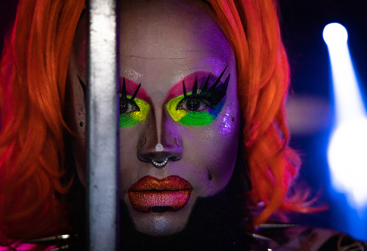 Originally a professional piercer, Ursula has augmented her already outrageous appearance with her piercing skills in order to entertain and excite audiences. After appearing on Dragula (a horror-themed reality drag competition looking to find the next drag supermonster), Ursula has used her drag to push outside of the box that some contestants find themselves stuck in after the show. Her drag performances tend toward the unexpected and keep people wanting more—a “palate cleanser,” a she calls herself. Often, she incorporates high-glamour makeup looks featuring a big, beautiful body covered in lush hair. “I like to turn my ‘distractions’ ([as] some people [would call them]) into something more powerful.” She says that she recently ditched traditional padding used to mimic the female body in favor of waist training. “I stopped wearing padding because it was sweaty, and I was tired of it. [Then] I started waist training. Now, I synch my waist 40% smaller than my actual waist.” She says people have called her lazy, but she knows it’s more work to be her authentic self. as a hairy, non-padded femme myself, I completely agree.