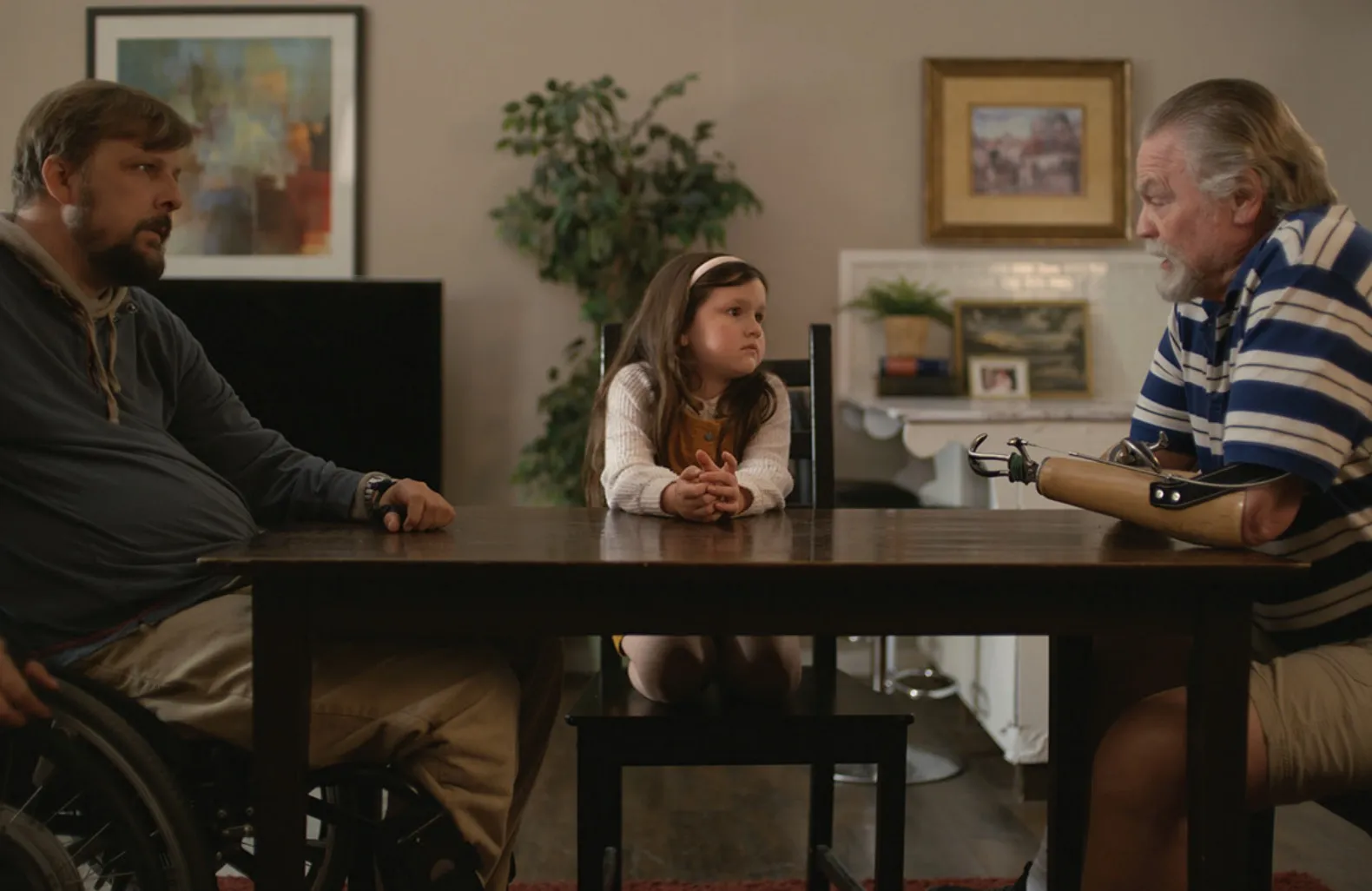 Patrick quickly realizes just how difficult it is to be a father and decides to give up custody of his daughter to her late mother’s grandparents, who accept on one condition: Patrick must bring the child across the country to Rhode Island. Planes are out of the question due to his fear of flying and the lack of wheelchair accessibility. Patrick enlists the help of his neighbor Robert (John W. Lawson), a fellow disabled veteran who despises Patrick for his alcoholism and chaotic lifestyle. Despite his contempt for Patrick, the two embark on a cross-country journey to bring his daughter to her grandparents.