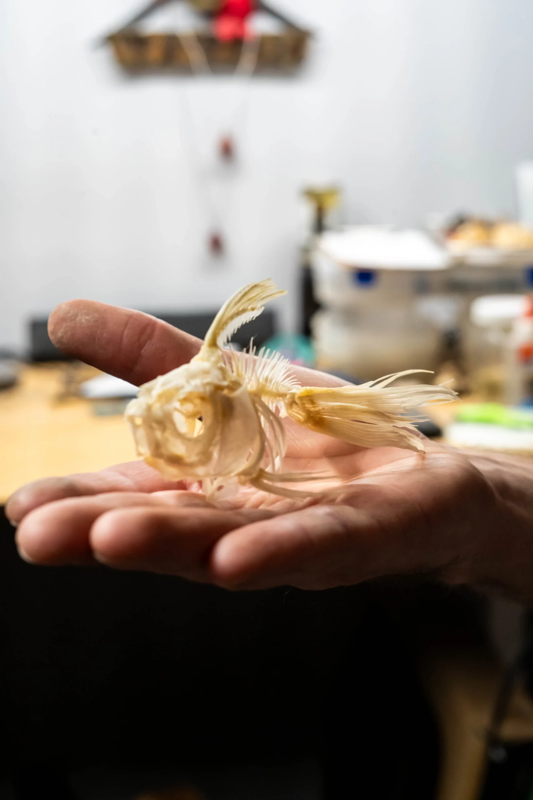 The process starts with Dermestid beetles, who eat away the flesh section by section—a task which can take months. Next, the bones are degreased and whitened. Dove will then drill holes in the bones and piece them back together with wire. “[The clients] pick the pose; I do my best to match it,” he says. “At that point it becomes sort of an art project.” Dove mostly works with cats and dogs, but his biggest project to date has been a horse; other animals in his repertoire include goats, snakes, chickens, goldfish, rats, turtles—even a kinkajou and an anteater.