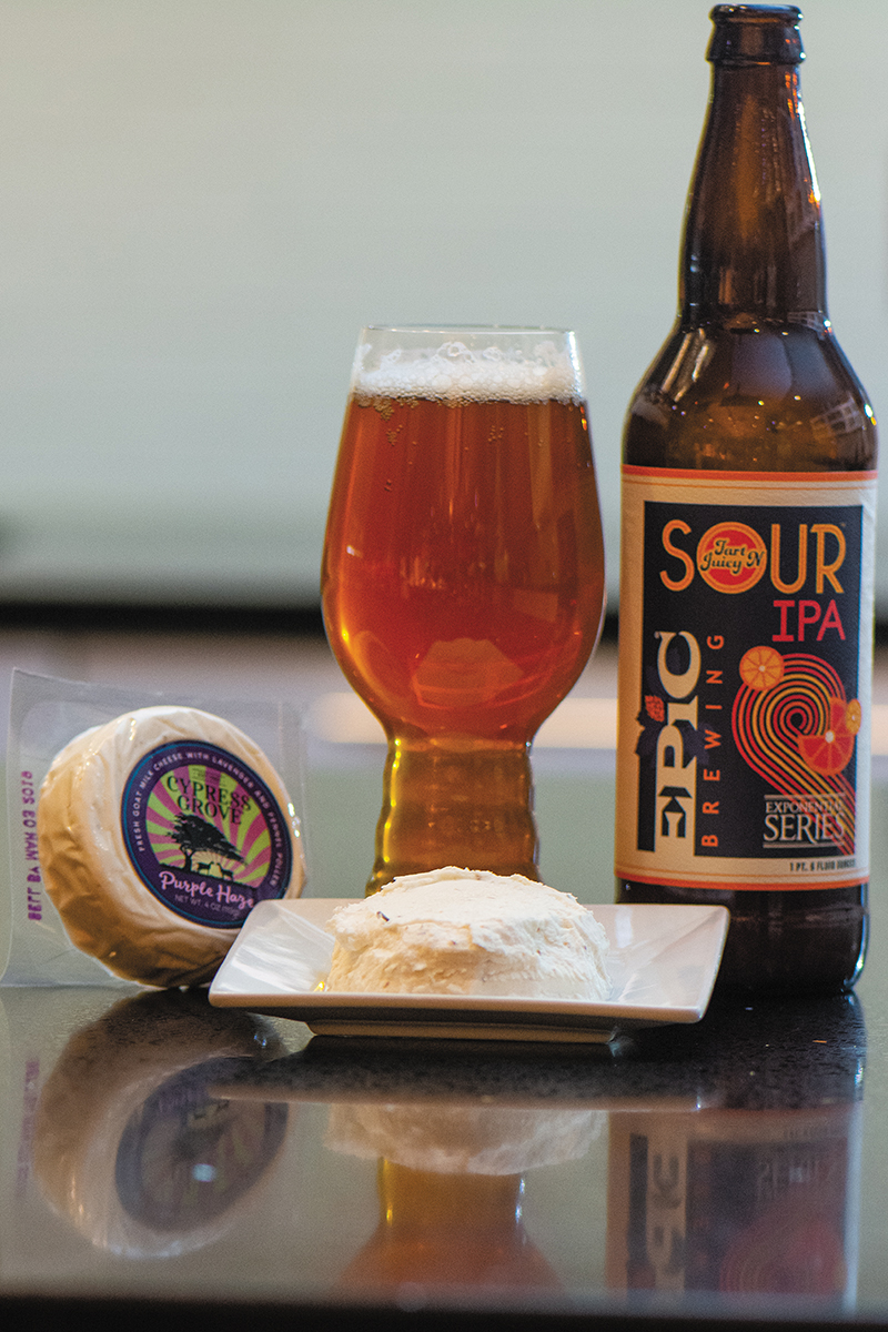 This has to be one of my favorite pairings of all time. It’s bright, fun and has the most delightful finish. Epic’s sour IPA is upfront with lots of citrus and sour notes, almost like a Sour Patch Kid with the “red” flavor. It’s funky but not full-on Parliament, and it’s hoppy but not so bitter that it inverts your face. It’s crisp, relatively clean for a sour and has that under-ripened, red-fruit flavor in the finish. Partnering it up with a fresh chevre is a no-brainer, but partnering it with a fresh chevre that has fennel pollen and lavender might sound a bit strange—it’s not! The beer tames the fennel pollen into a lightly sweet aroma that almost has a touch of a cinnamon character, while the full fat of the goat milk tames the sour aspect of the beer. Fat can be both a vehicle for flavor or can be used as a diffuser of strong flavors. The finish is the real kicker, though, as the sweet goat’s milk and citrus hops couple up to produce a lemon-chiffon note that shows up late and then lingers on the palate.