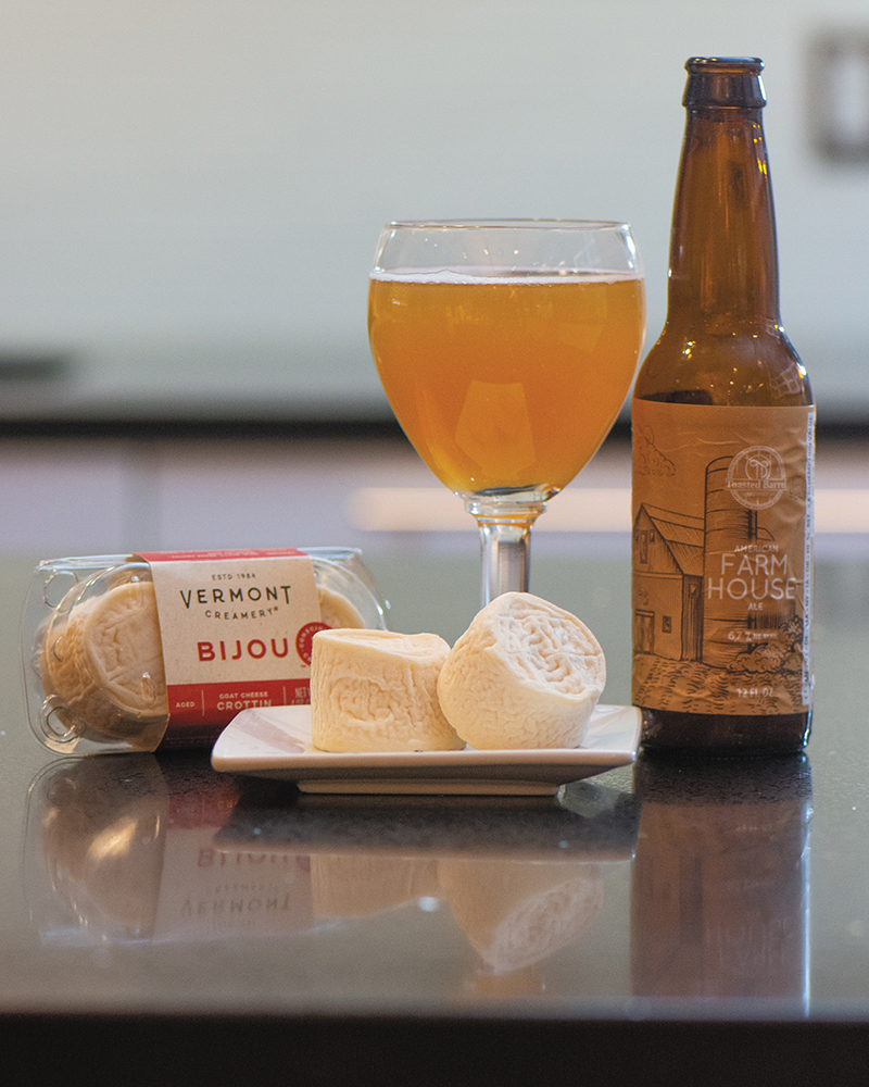 This is a somewhat more aggressive pairing, in that there are Belgian yeasts in the beer, and the cheese is made from goat’s milk with a yeast rind—a potential for A LOT of flavor. This beer exhibits herbal and fruity notes while having a crisp, almost cider-like finish. A fun fact about this beer is that all but the hops are sourced from within the state of Utah! “Married to this beer is a Bijou” (French for “jewel”) from Vermont Creamery, which is a soft, ripened-goat’s-milk cheese that has a geotrichum yeast rind. Mention this yeast to almost any seasoned cheesemonger, and you’ll certainly get an involuntary smile—we love this stuff! Characterized by a wrinkly exterior, this cheese is soft and luxurious with a mild acidity, tart fruitiness and a sweet-cream finish. The two play off of each other and bring out the fruity/herbal aromatics in the beer while enhancing the sweet cream of the cheese. Finish that off with a crisp, acidic finish and a clean palate thanks to the effervescence of the beer.