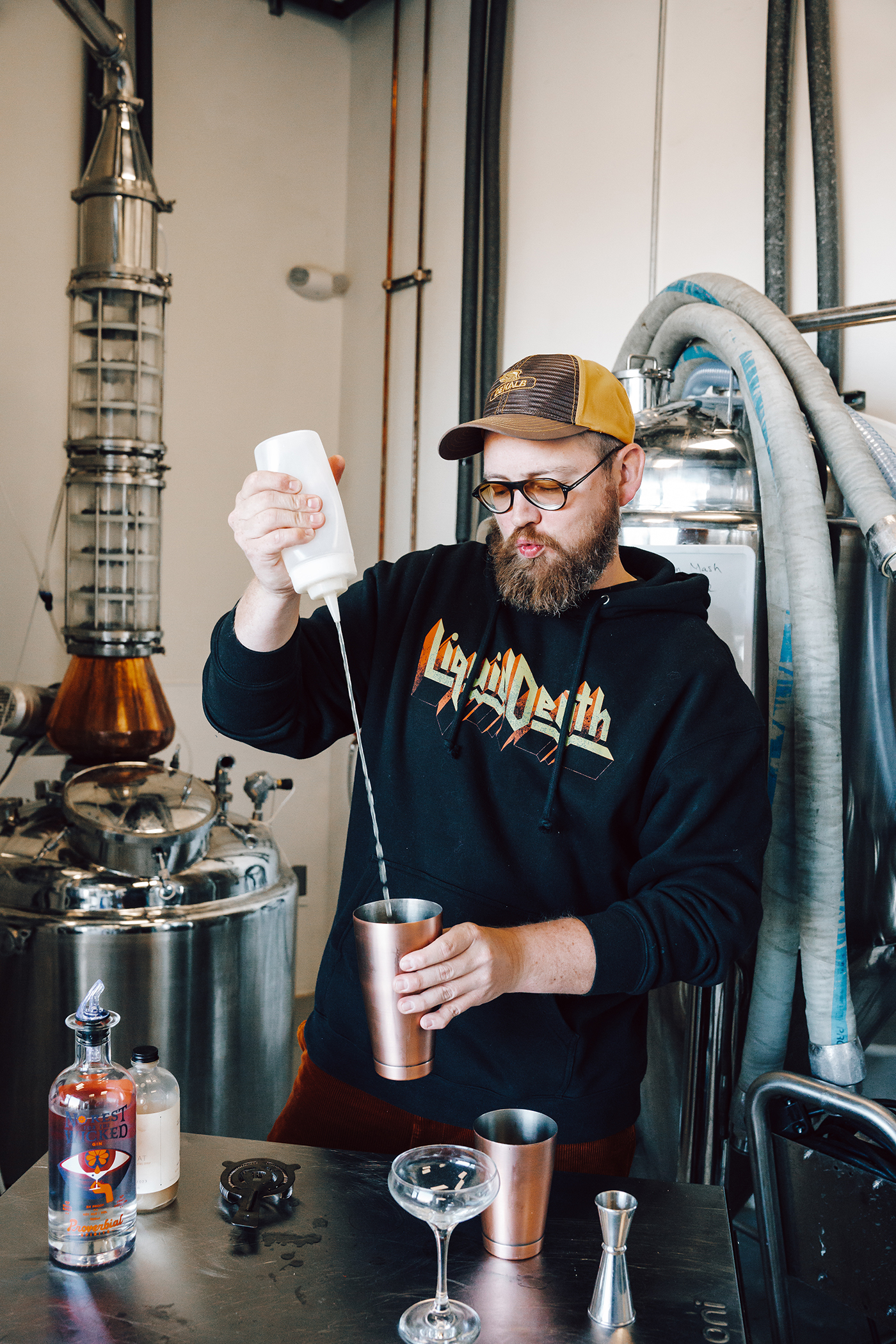 Michael Kunde of Proverbial Spirits pours a shot of Ain't No Rest For The Wicked Gin, one of Proverbial Spirits' two currently available spirits.