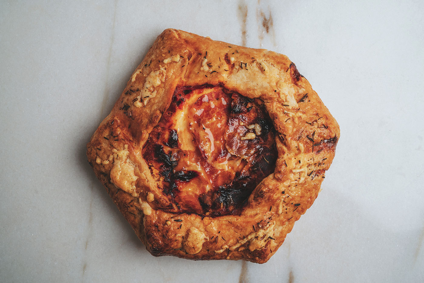 Once you have completed the mixing, roll the dough out in a large sheet and begin folding the dough into thirds. This will create multiple layers and will help marble the butter throughout. Repeat the process three–four times. Shape the dough into a folded rectangular shape and wrap in plastic. Chill for two hours (the dough will hold in the fridge for five days or six months in the freezer). When ready to use, measure out 113 grams of chilled dough and flatten to a circle shape with a rolling pin.