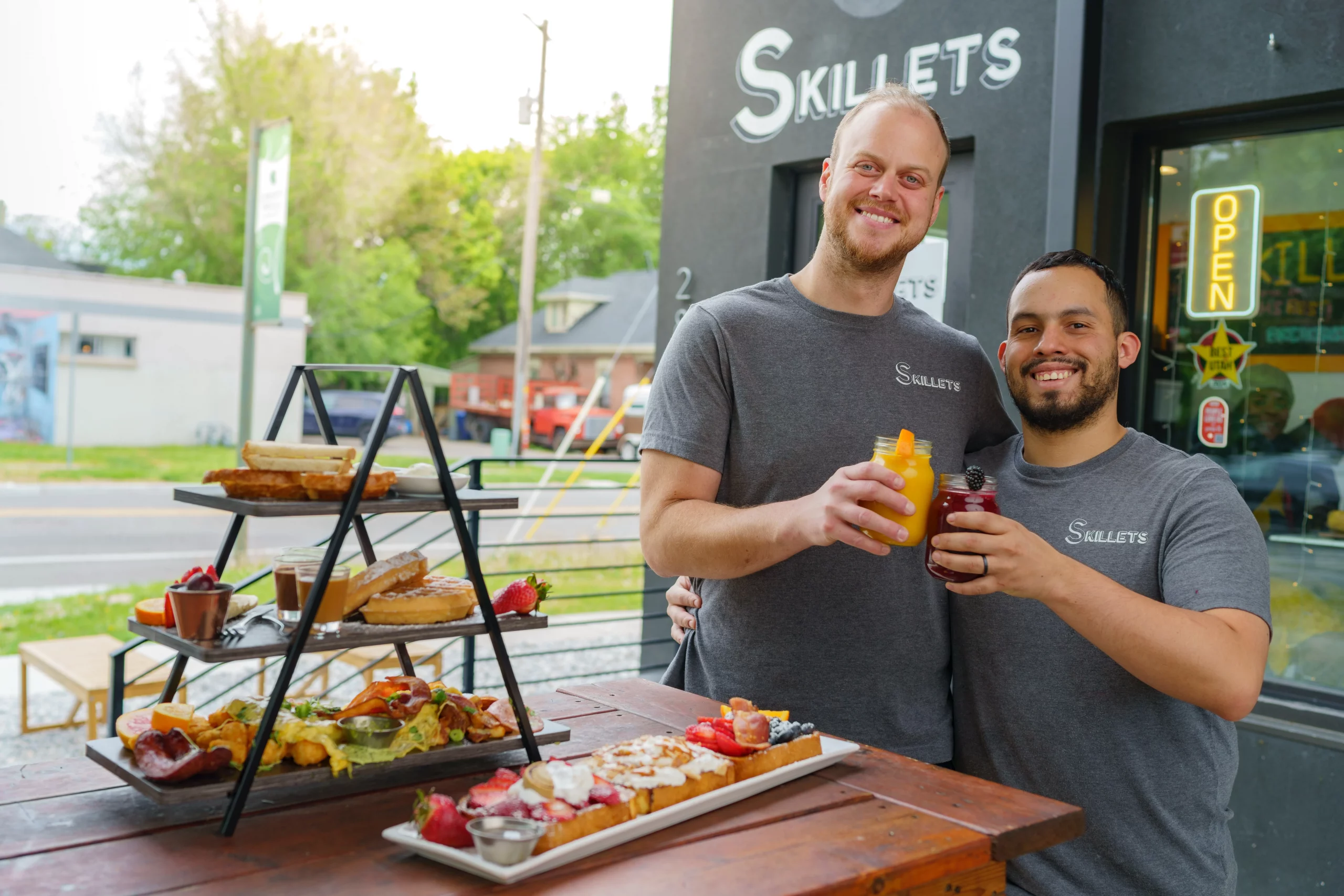 On a bright Saturday morning, I was tucked into the corner of a small bookshop in the Liberty Wells neighborhood, eyeing the back cover of a sci-fi novel when one of my companions spun into the room, coffee cup in hand and hair swept over her shoulder to tell me, “It’s time!” Immediately, the four of us all rushed out from different sections of shelves and hurried down the street because our table at Skillets was finally ready. We were almost vibrating in anticipation as the host led us through the building and to our table. We sat next to a window draped in curtains of string lights overlooking the ample patio seating, bringing to mind memories of street pubs — or, more appropriately, the feeling of dining at a food truck, which is exactly where this charming restaurant began.