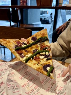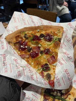 Prices and serving sizes vary based on the style, size and flavor of each pizza and more information can be found on their website, slicehouse.com. Aside from pizza, their specialty, the Slice House menu includes pasta dishes made from fresh frozen pasta, housemade meatballs, a variety of salads, and even wings. Soon, they plan to go live on the Slice House app to make ordering for pick up or delivery even easier, according to Lewandowski.