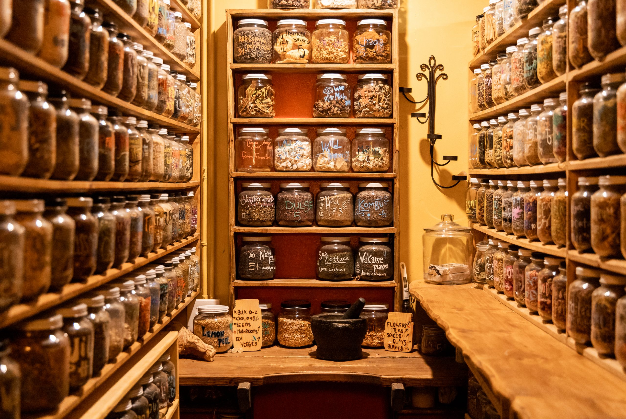 The walls of Natural Law Apothecary are lined—floor-to-ceiling—with jars of homemade remedies and tinctures.
