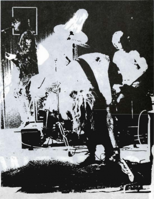 Opening the show was the Suave Mob Hip-Hop team who bounced and posed and made plenty of noises that went, “boom-chit.” (Incidentally, I saw these at the airport recently. I knew who they were because they all had the same big clocks hanging around their necks.) Following them was our beloved Dinosaur Bones, who were right on the mark. Singer JR Ruppel looked every bit like Joey Ramone with shop glasses, and confusion resulted when a surreptitious pair of panties landed on Brett’s drum kit. The crowd stirred them into delivering a tight and raunchy set, and the reaction was good. JR even initiated a sticker toss, which went off well. Guitarist Scott Bringard, a devout Bauhausian, looked and sounded good enough to ensue chicks to flock (sorry, Scott). Chalk up a good night for Dinosaur Bones.