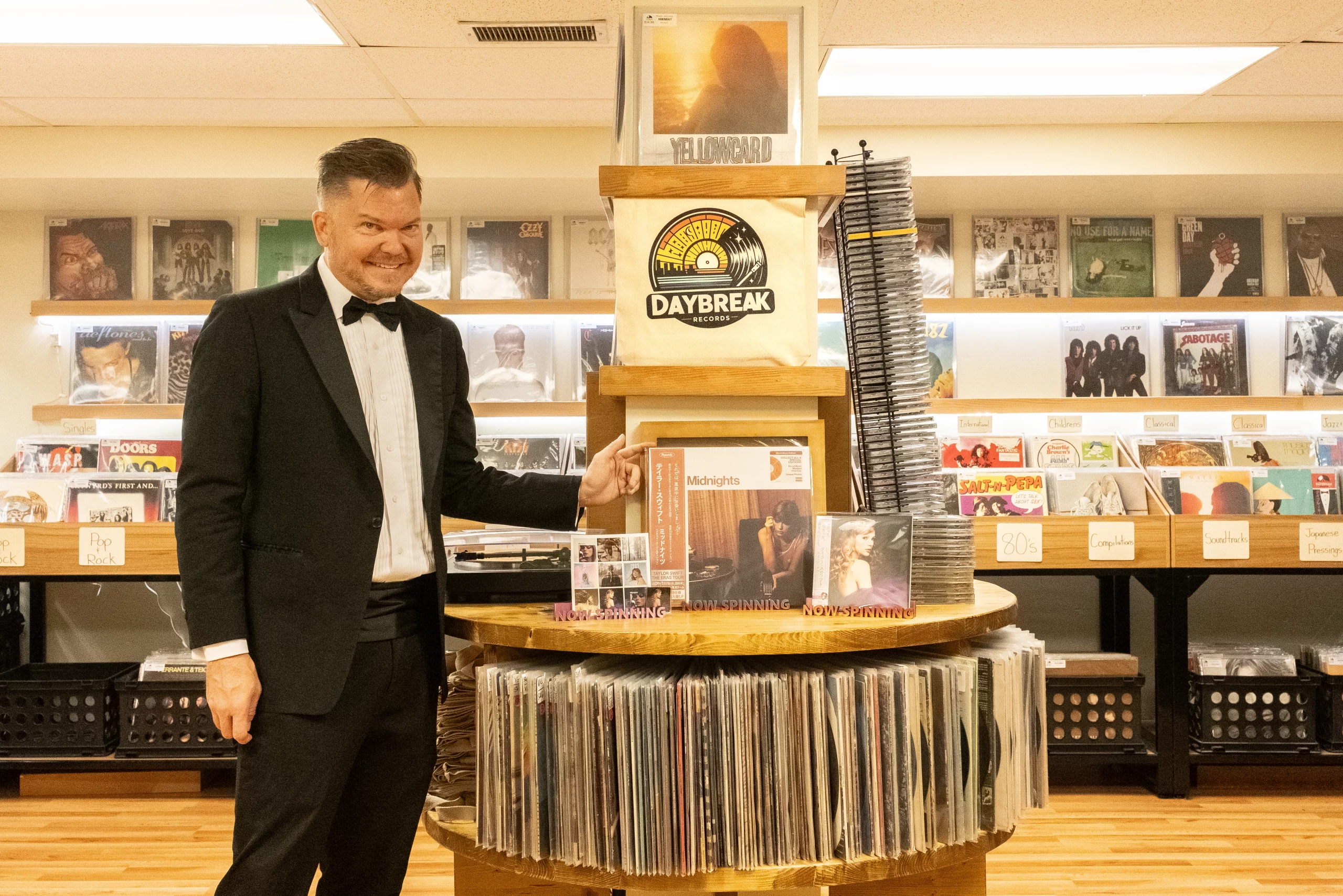 “When I had watched these other auctions, there was a very impersonal feeling,” says Sherwood. “These guys made very little effort to be welcoming or inviting. They looked like they just got out of bed and doing the auction was some kind of inconvenience for them, and I wanted to change that, so I thought, ‘What if I was the best-dressed auctioneer in the world?’ It might signal to people that they’re dealing with a person of quality and at Daybreak Records, they’ll get quality records. Elements like a wall full of records with secret discounts or prizes or giving away credit developed out of naturally just wanting to have fun with it.”
