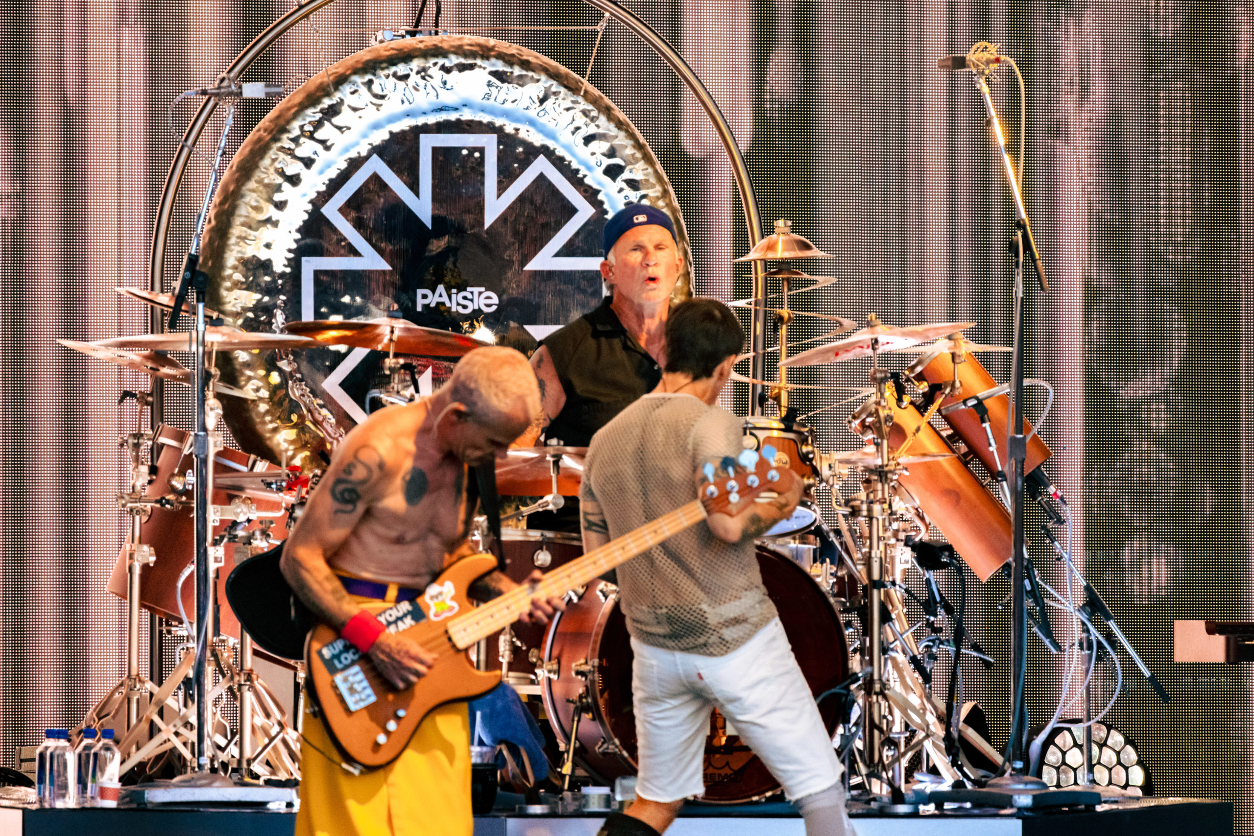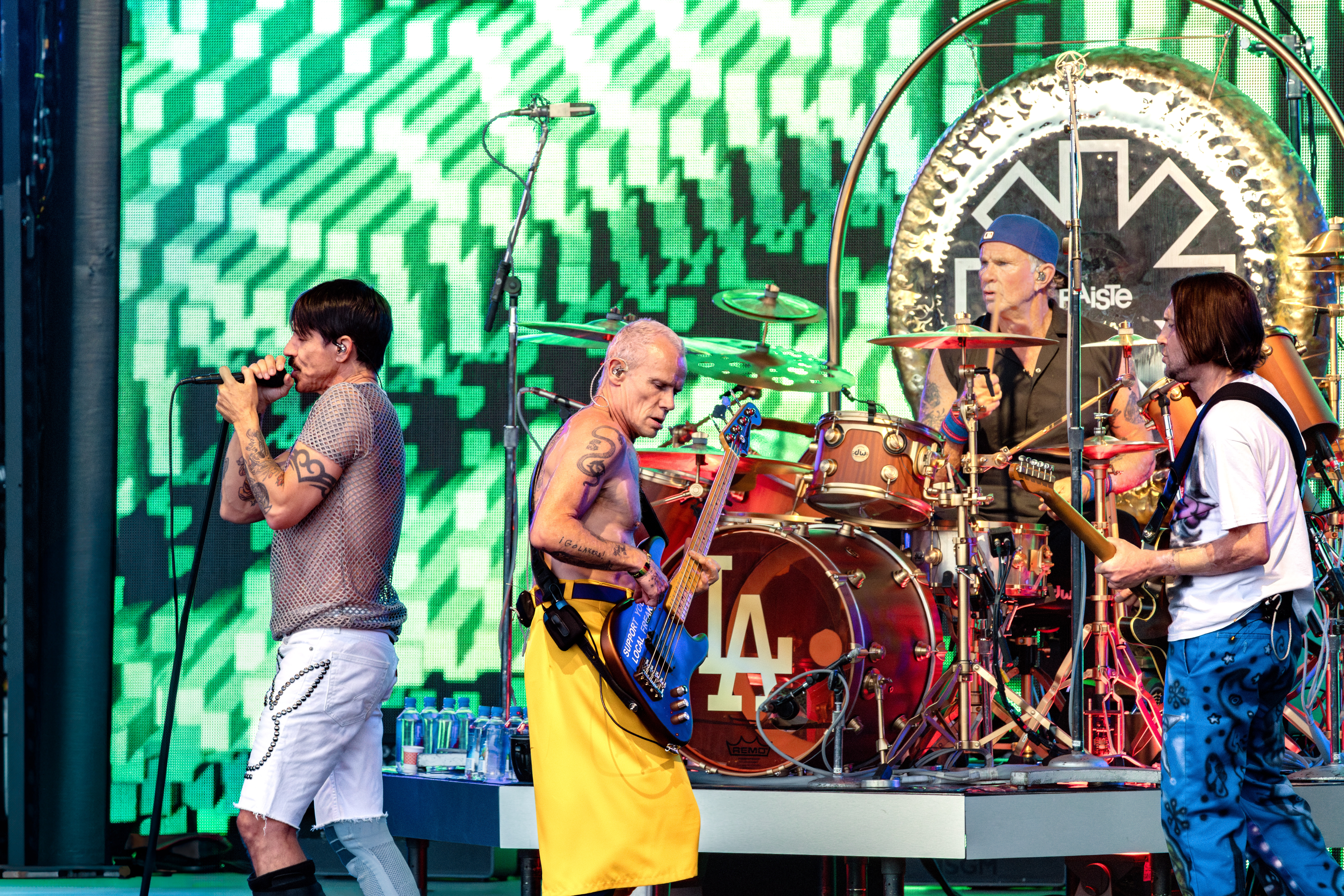 The Red Hot Chili Peppers during their opening songs, playing on stage at the Utah First Credit Union Amphitheatre. Photo: @lmsorenson