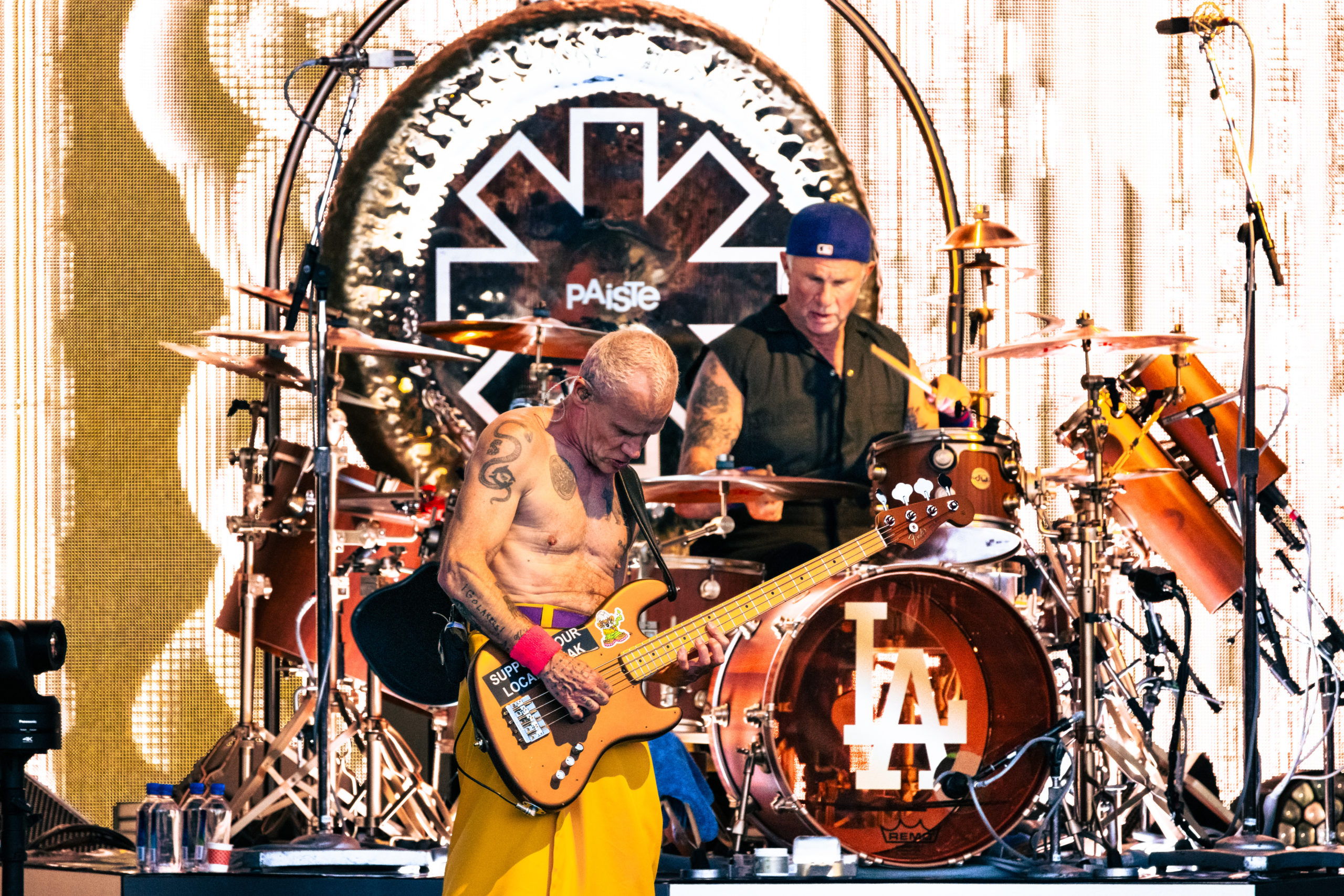 Flea stands with a wide stance playing bass in front of the fans, with Chad Smith playing drums to the side while on stage in Salt Lake City, Utah. Photo: @lmsorenson