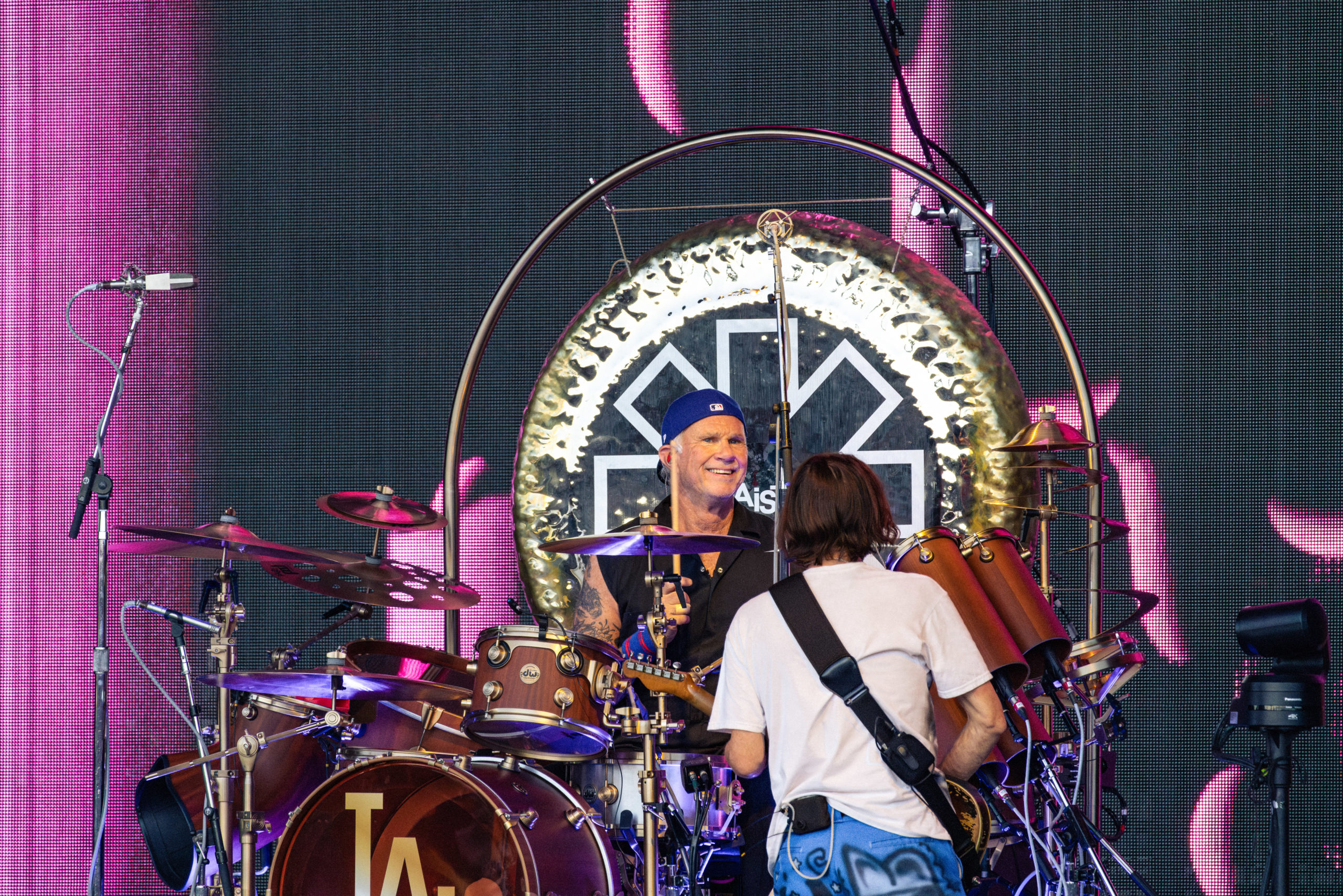 Bag checks, merch lines and $14 beers await the masses making it to their designated areas. As the sun slackens, duo Domi and JD Beck starts it all off. The keyboard-and-drums pair do quick introductions and get right to it with intense jazz tracks. As they finish a song and prepare for the next, they thank the Red Hot Chili Peppers for having them come for this stop on the tour. JD Beck comments, “It should be illegal for the sun to be this bright,” as the stage gets the full brunt of the sun beaming down on the venue. Passionate jazz continues as attendees get their beverages, and just as soon as the music started, the sun heads down and they finish up their set.