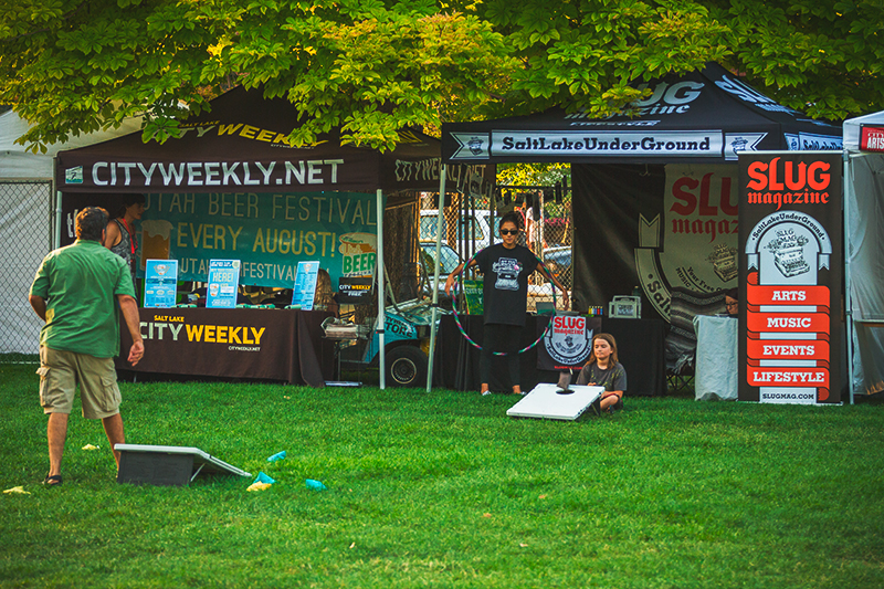 A father and son play a pickup game of corn hole provided by SLUG Magazine Thursday night. Photo: Talyn Sherer